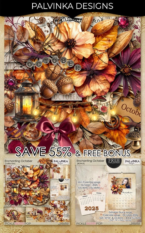 ✨ New Weekend Goodies Are Here! ✨Get ready for a weekend full of creativity and sweet surprises! We have loads of new releases that are perfect for your next scrapping session — and we’ve got some amazing freebies to go with them! 🛍️ FREE with PU Purchase! Shop any Personal Use products totaling $20 or more, and you’ll receive our Grandma's Attic Collab Kit absolutely FREE! It’s the perfect way to treat yourself and your scrapping stash. 🎨 FREE with CU Purchase! Calling all designers and creative pros! Spend $20 or more on Commercial Use goodies this weekend and get our CU Sampler for FREE! Add a little extra magic to your design toolkit. 🎃 October SCRAP♥Bingo Is in Full Swing! Join the fun in our monthly challenges! Complete just two Bingos and you’ll earn our exclusive October Challenge Reward Kit – Grandma’s Attic – FREE! Filled with vintage charm and cozy nostalgia, this one’s a must-have for your collection. Head to Pickleberrypop now, grab your favorites, and enjoy your weekend of creative play! |